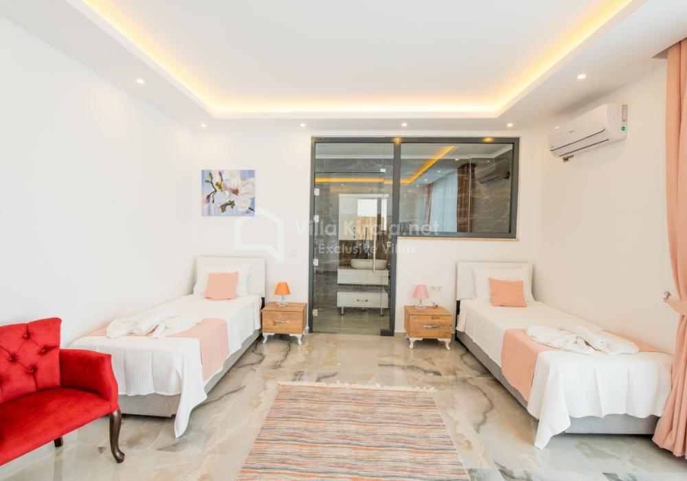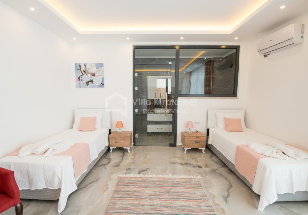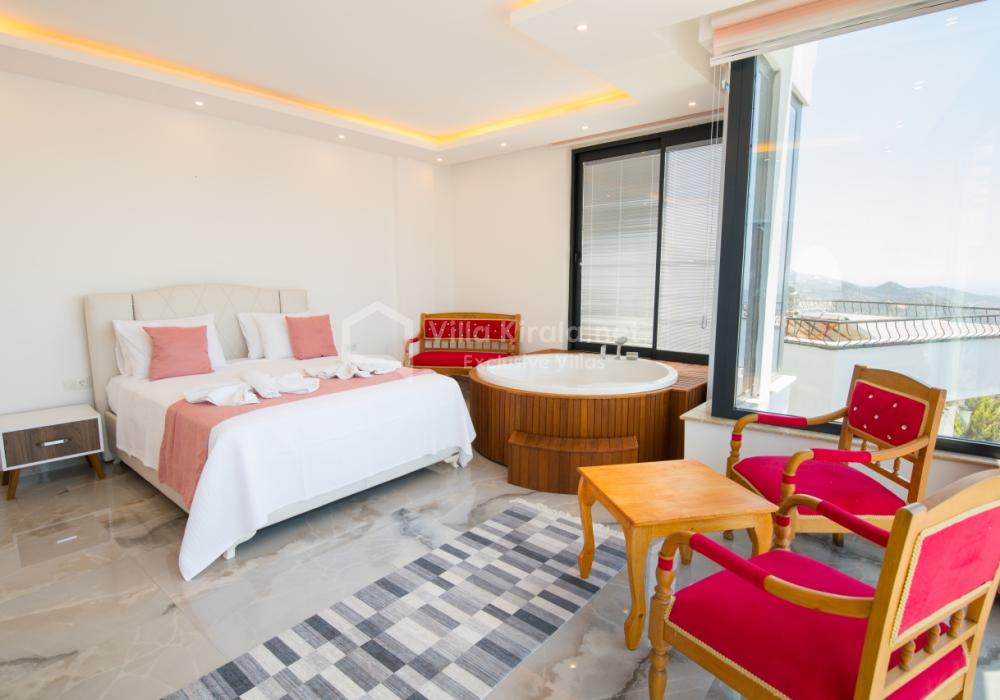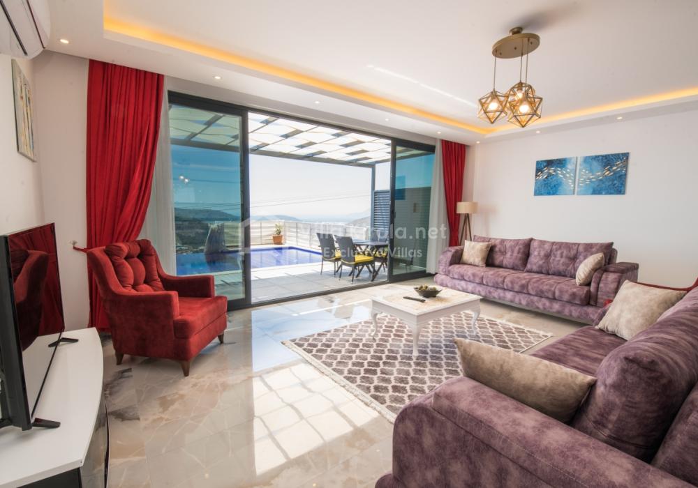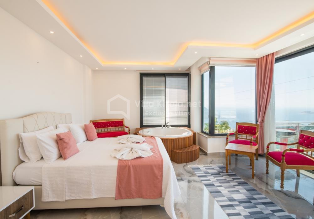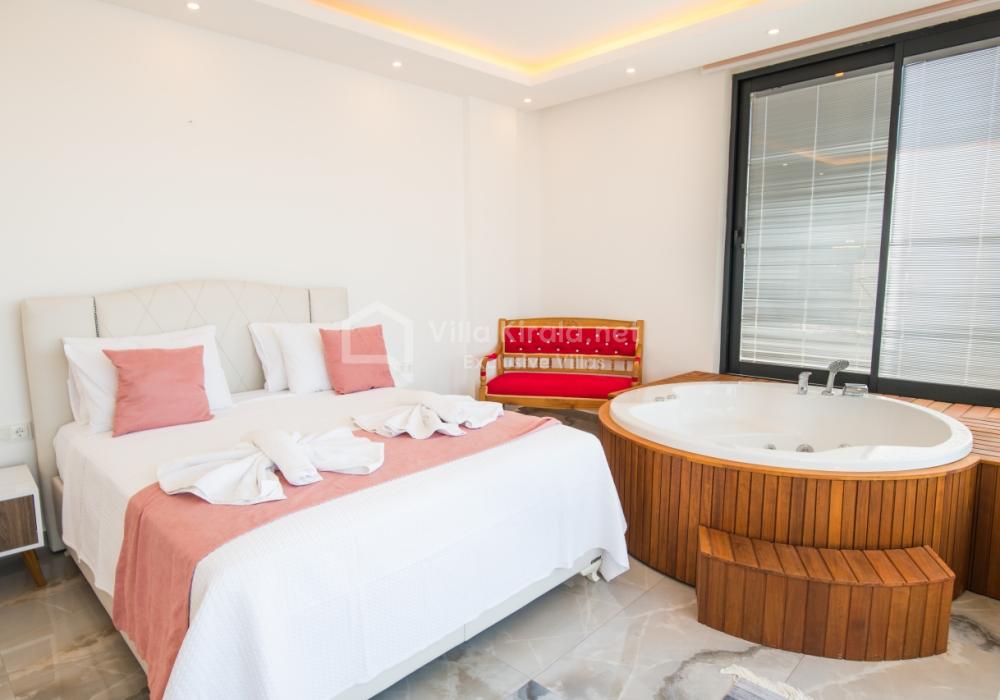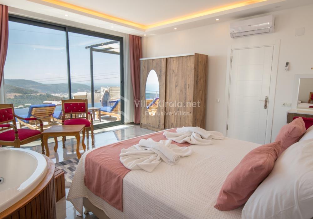 Our luxury holiday villa with panoramic view, which was completed in July 2019, is an ideal villa for our honeymoon couples and small families. No expense has been spared for the comfort of our valued guests by using quality furniture and white goods in our luxury villa with a capacity of 5 people. Our holiday villa, located in the region with the most beautiful view of Kalkan, the symbol of silence, is 6-7 minutes away from the center of Kalkan by car. You can rent our villa that will add color to your holiday with its private jacuzzi in the room, magnificent view and luxury design and you can enjoy an unforgettable holiday.