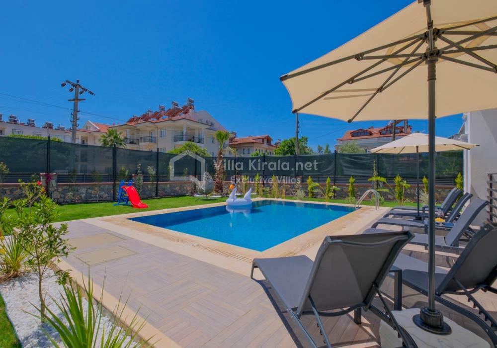 La villa cuenta con piscina privada completamente protegida de 8 m × 4 m × 1,55 m.