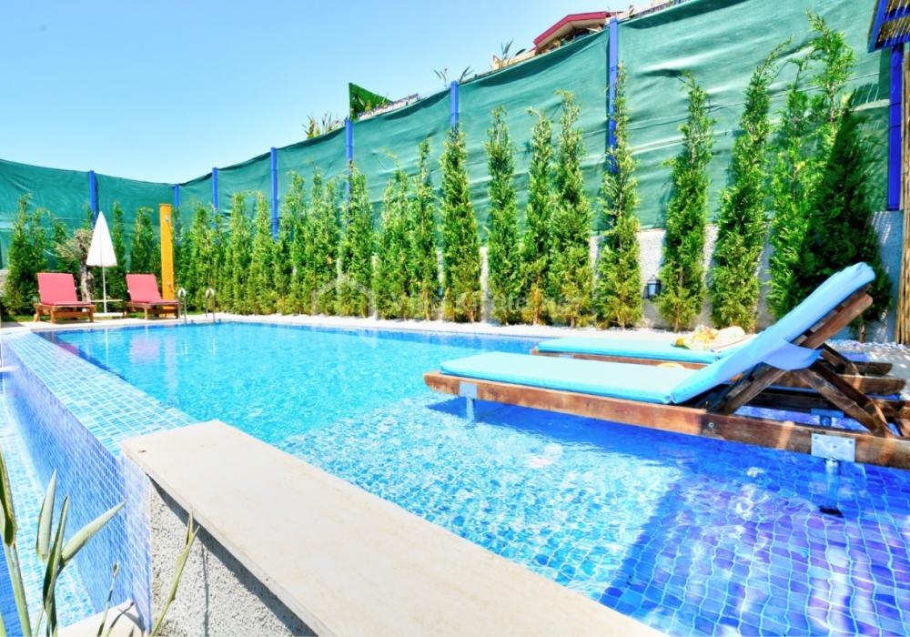 Bahçe:Yüzme havuzu,şezlong,şemsiye,bahme masası,barbekü alanı