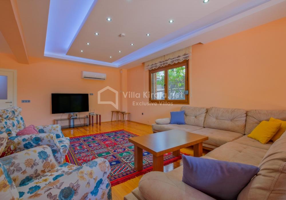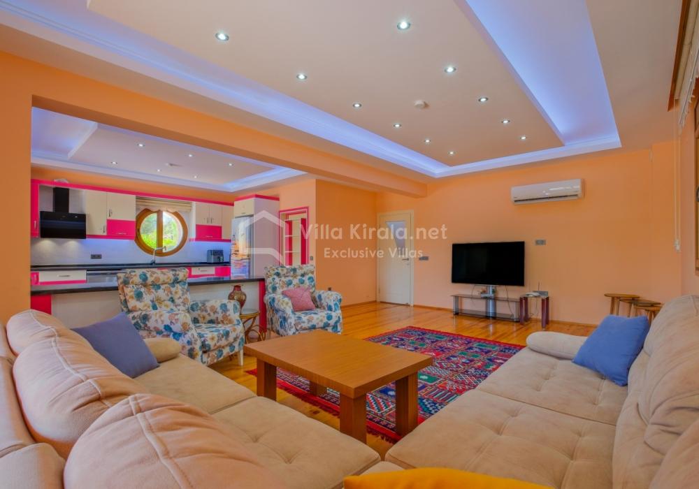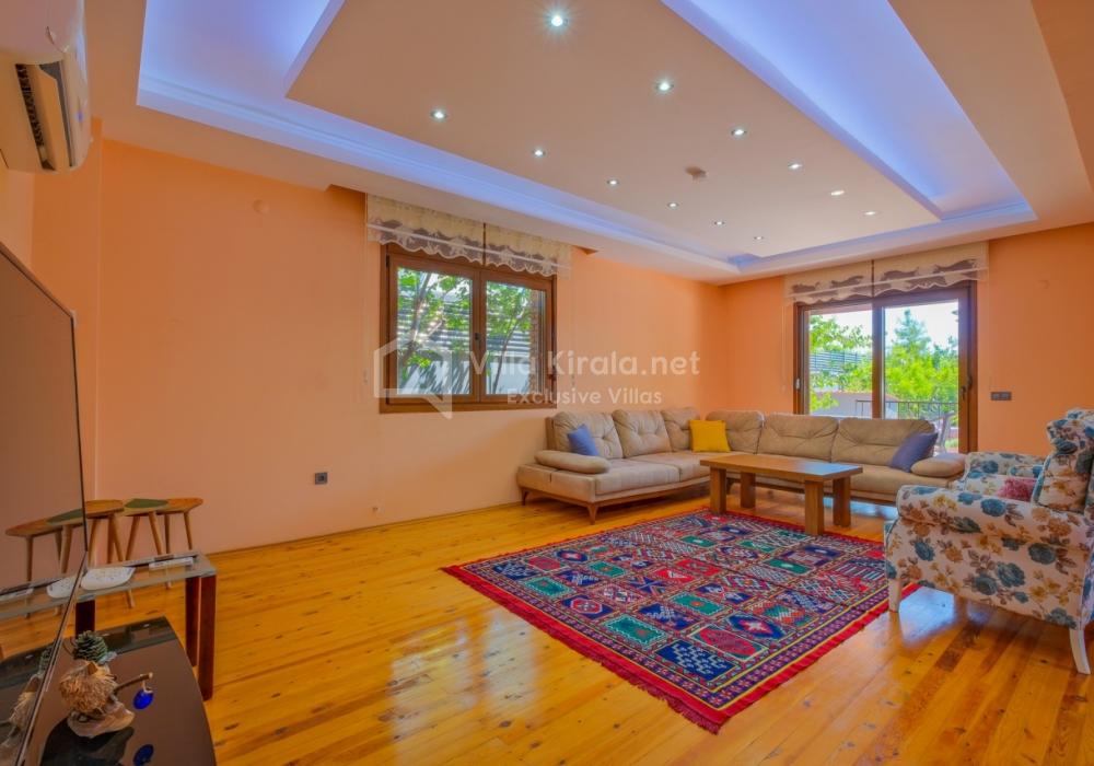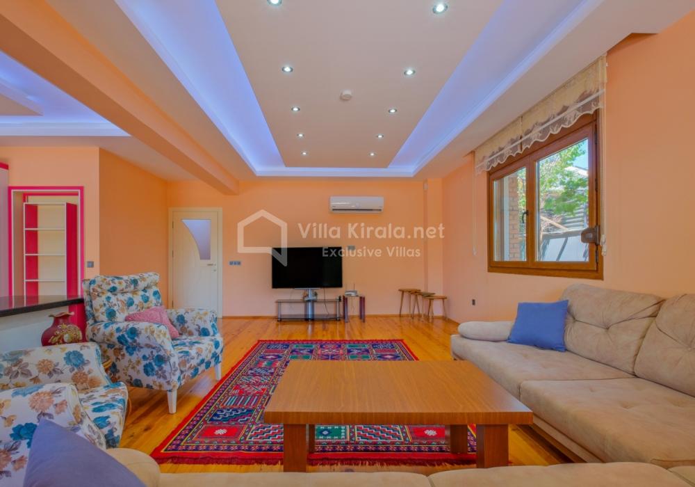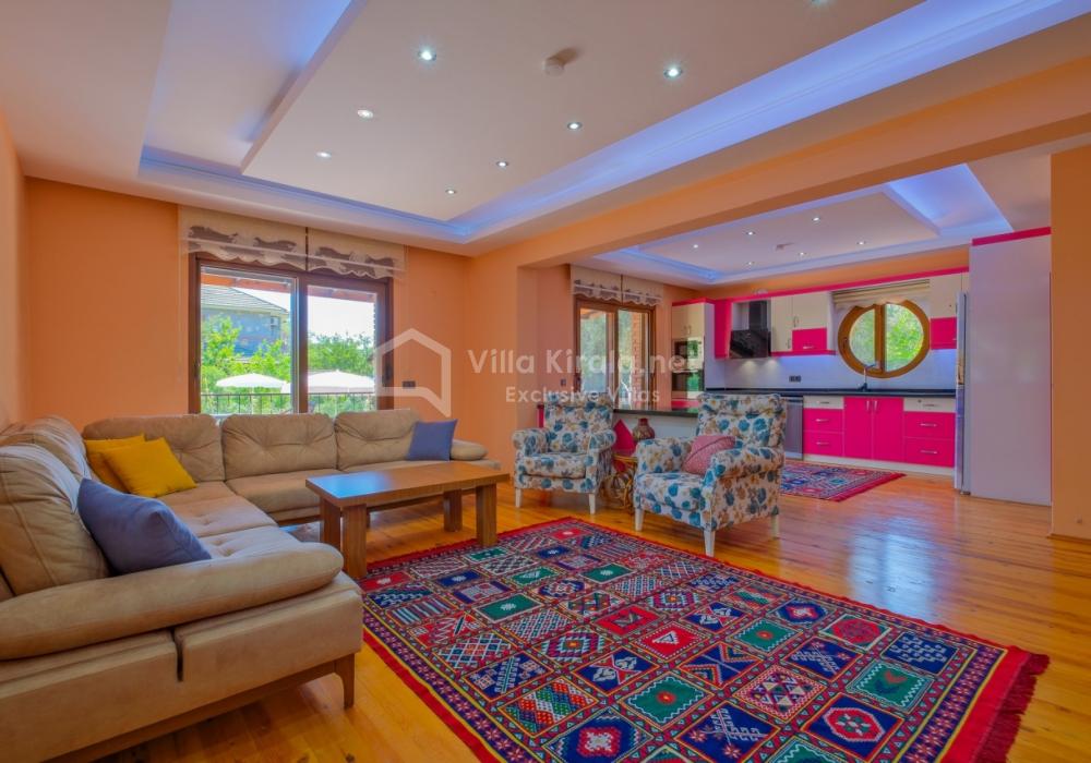 Salon: Şömineli, TV ve uydu alıcılı modern bir oturma alanı; yemek masalı şık bir düzen; konforlu koltuk grubu ile ferah bir ortam sunar