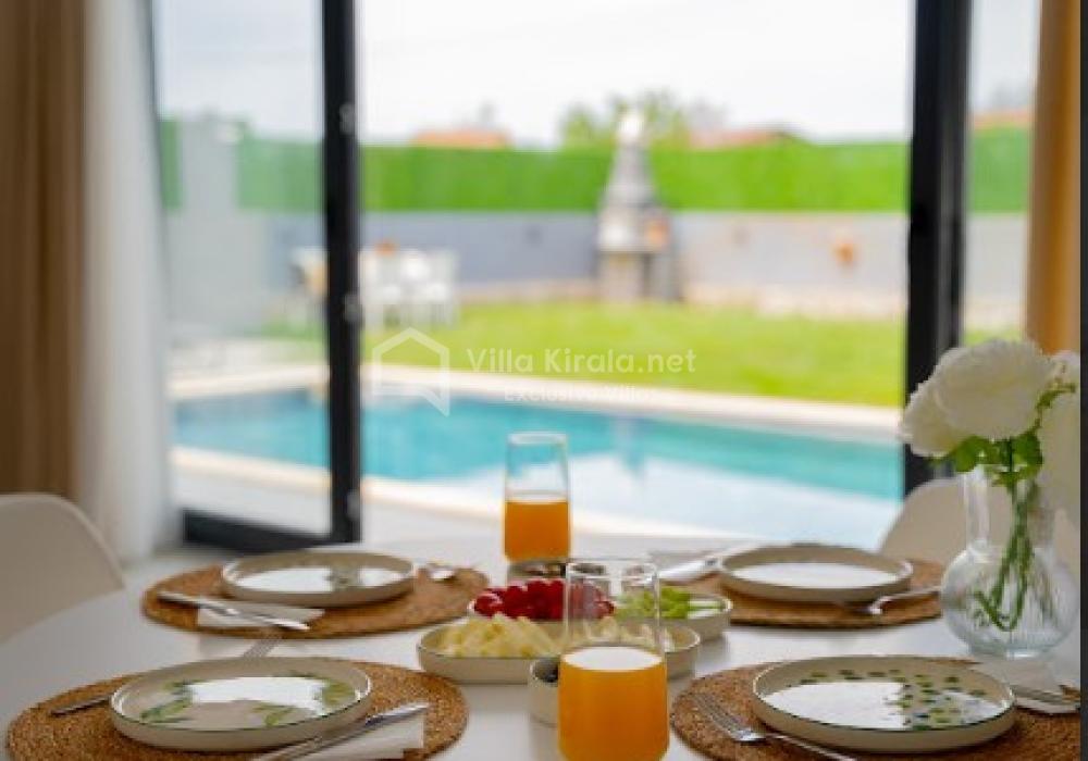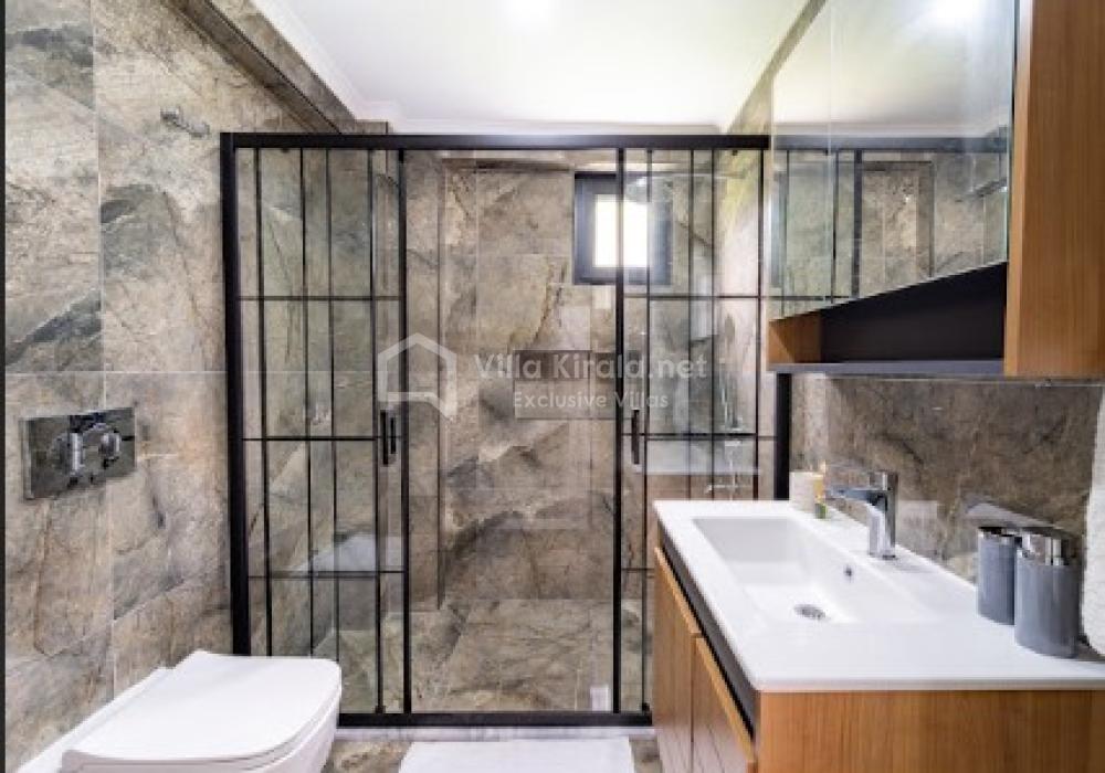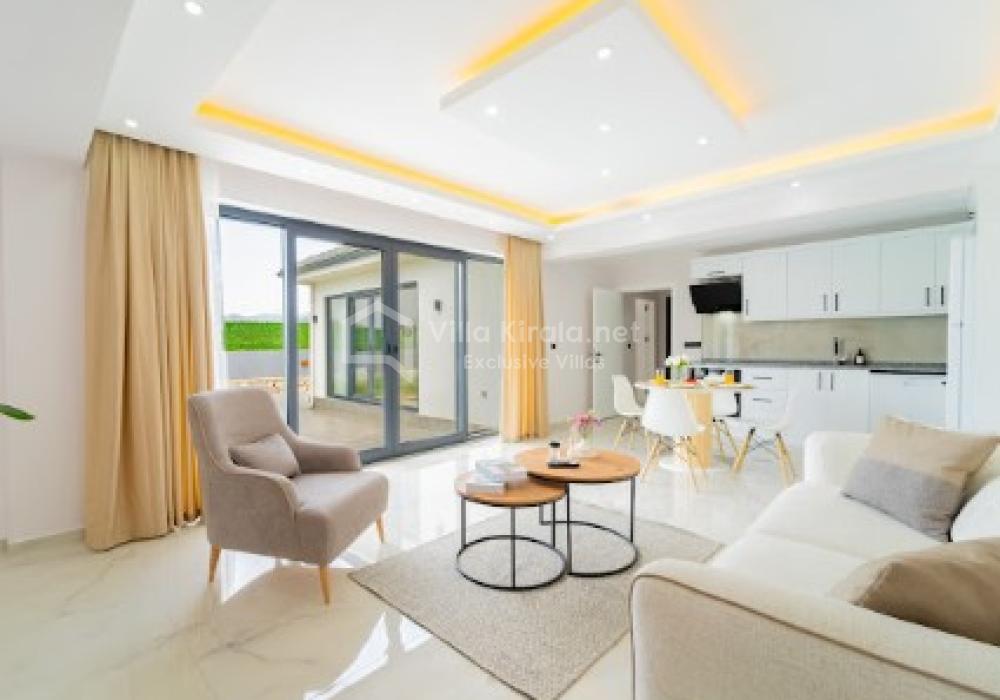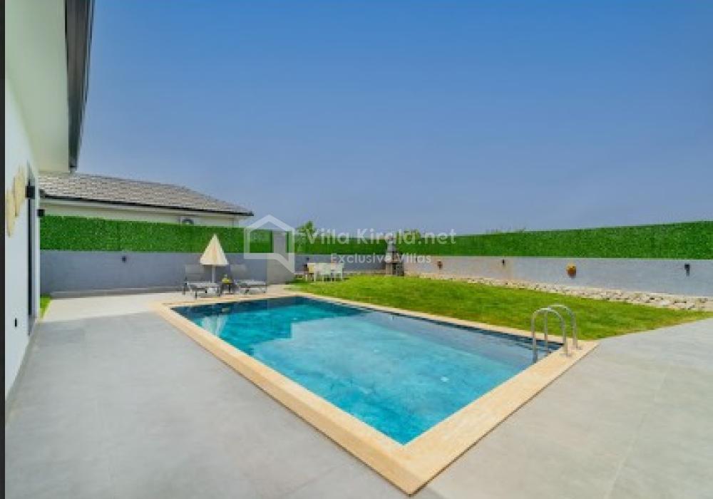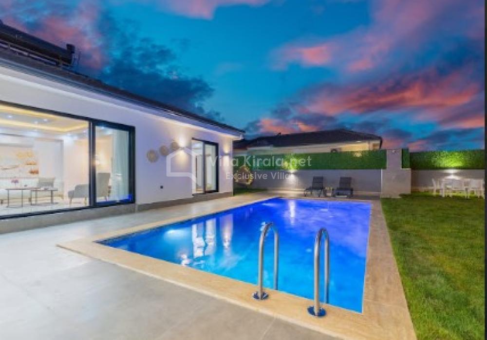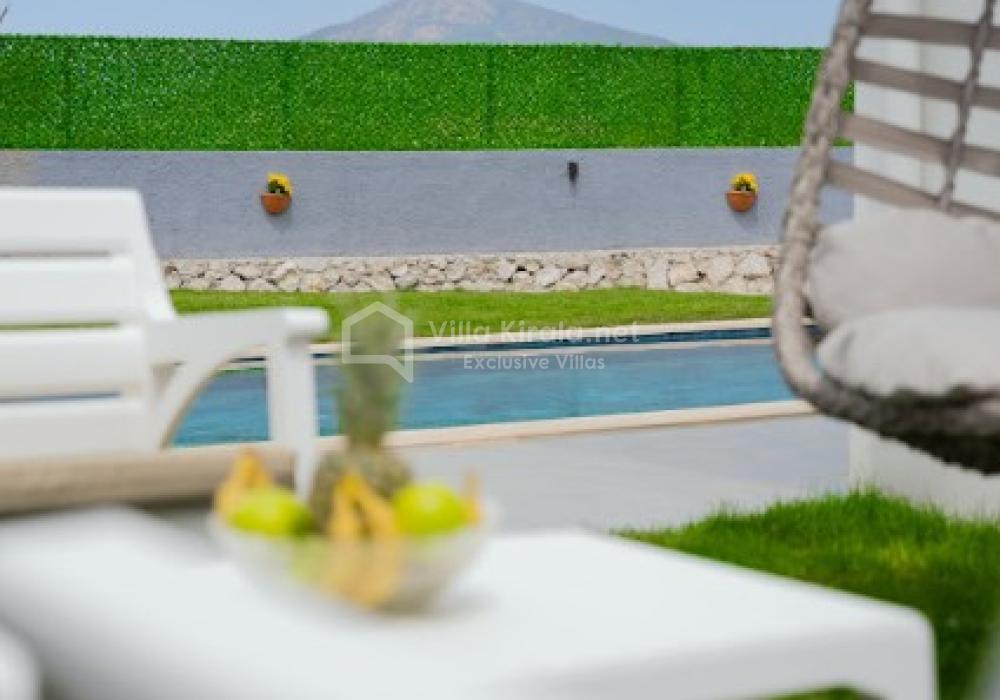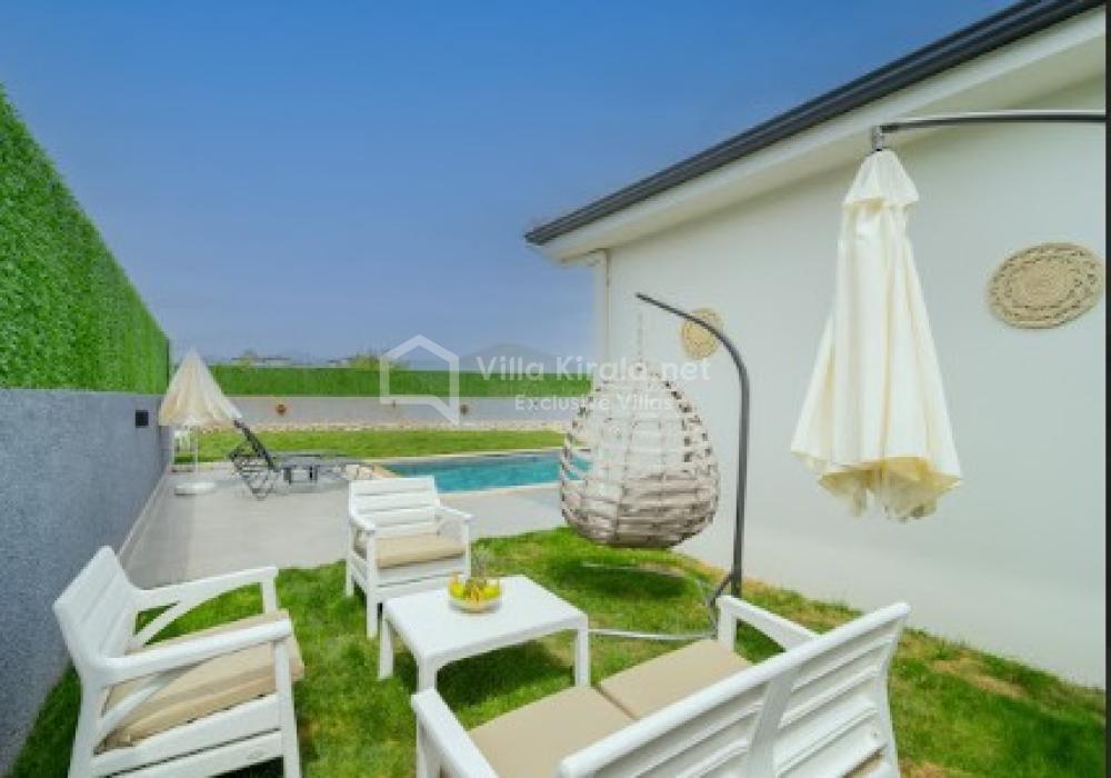 Özel bahçe alanında yüzme havuzu, 2 adet şezlong, şemsiye, 6 kişilik yemek masası ve sandalye, damla salıncak, oturma grubu ve taş barbekü bulunmaktadır.
